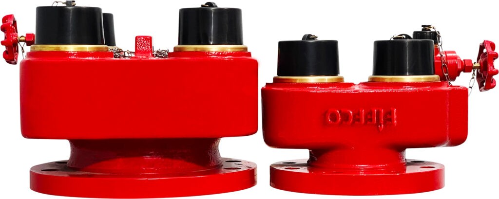 An Inlet breeching valve is installed at ground level to provide a connection to the water supply. The system is usually dry and charged by the fire brigade in an emergency. FS120 has 2 inlets and FS121 has 4 inlets which are 2 ½” which are 2 ½” male instantaneous connections to BS336 and fitted with non-return valves, a 1” drain valve, caps and chains. 2 way and 4way inlet breeching valves can be installed in the vertical or horizontal position.